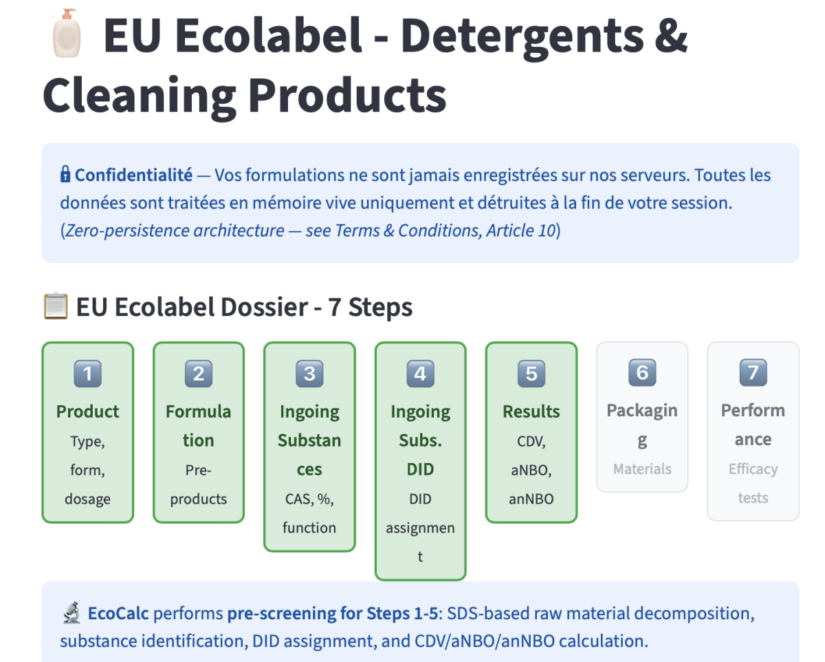 And for any organization pursuing an EU Ecolabel certification? The reality is months of painstaking work — collecting ingredient data, computing CDV scores, cross-referencing the DID List — just to find out whether the formulation even has a chance of meeting the criteria. Months of effort, often before a single decision can be made.