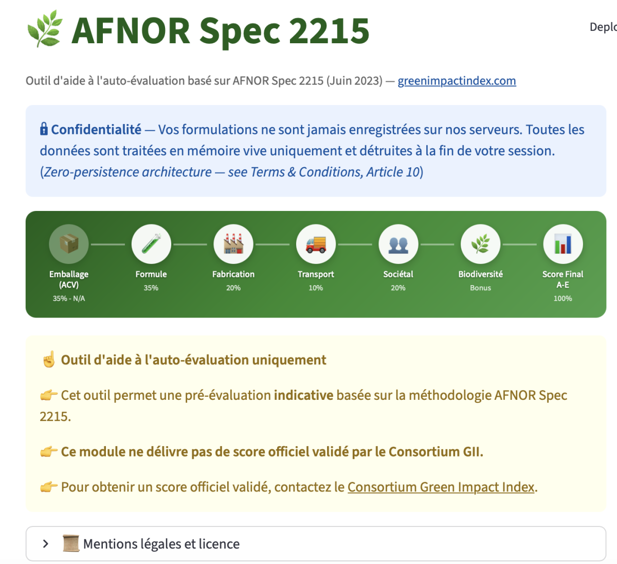 The AFNOR Spec 2215 module the implements most of the scoring methodology defined by Green Impact Indexconsortium, which provides a multi-criteria environmental and societal evaluation framework for cosmetic products. The module assesses formulation ingredients across biodegradability, ecotoxicity, and other environmental dimensions, producing an overall sustainability score. As with the Ecolabel modules, this is a pre-screening tool — it gives formulators a reliable early indication of how their product performs against the Spec 2215 criteria, allowing them to iterate and improve before any formal evaluation. The scores produced by EcoCalc are working estimates, not certified results, but they significantly accelerate the formulation optimization process.