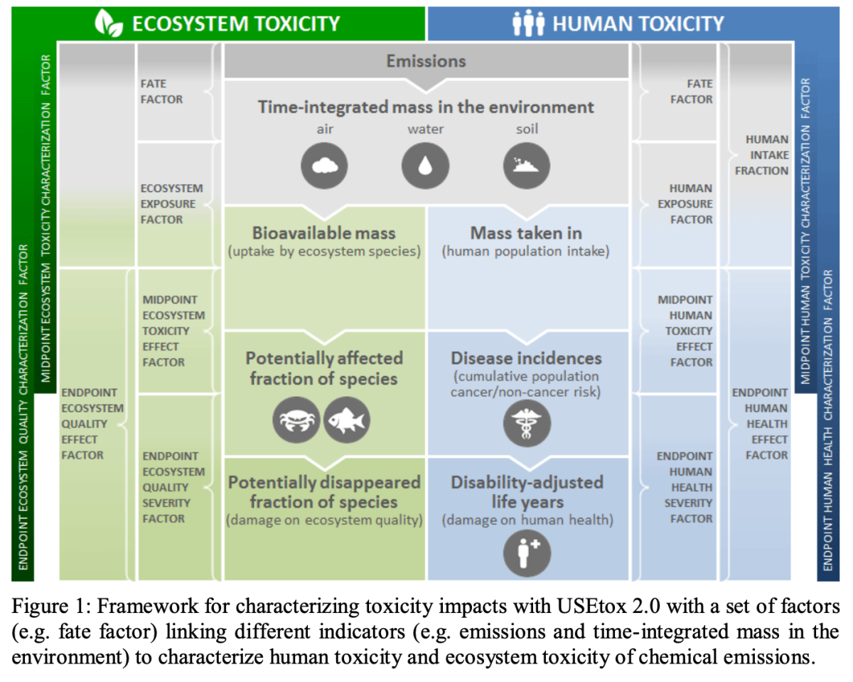 A practitioner viewing this diagram would naturally conclude: "USEtox measures the fraction of species affected and the fraction that will disappear, just as it measures disease incidences and disability-adjusted life years for humans (this unit will be discussed in a future article)."