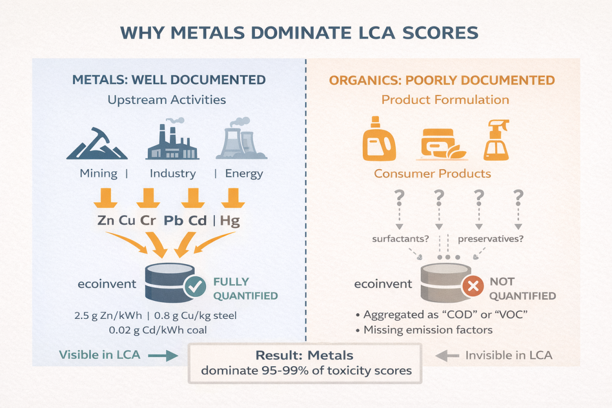 Result: Organic chemicals relevant to consumer exposure (cleaning products, cosmetics, air fresheners) may be entirely absent from the LCA inventory, while metal emissions from electricity production hundreds of kilometers away are fully quantified.